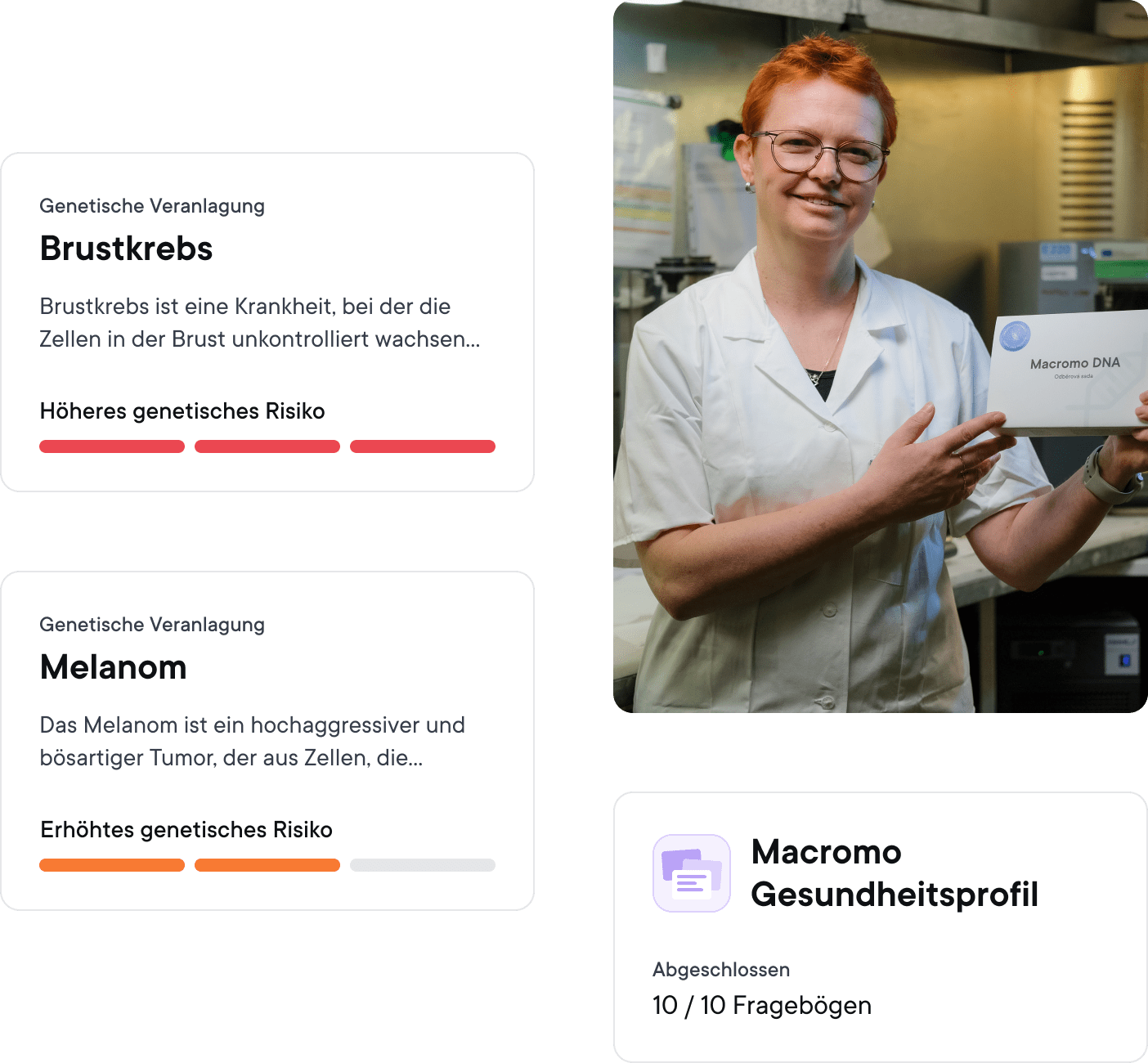 Bei Macromo stellen wir keine Krebsdiagnose. Unsere DNA-Tests bestimmen Ihre Veranlagung für bestimmte Krebsarten auf der Grundlage Ihrer Genetik. Sie können die Ergebnisse mit Ihrem Arzt besprechen, wenn Sie Bedenken haben. Der DNA-Test sollte als Präventivmaßnahme eingesetzt werden, um Sie über mögliche Risiken zu informieren und Ihnen die Möglichkeit zu geben, diese durch eine Änderung Ihres Lebensstils und regelmäßige Kontrolluntersuchungen zu verringern.