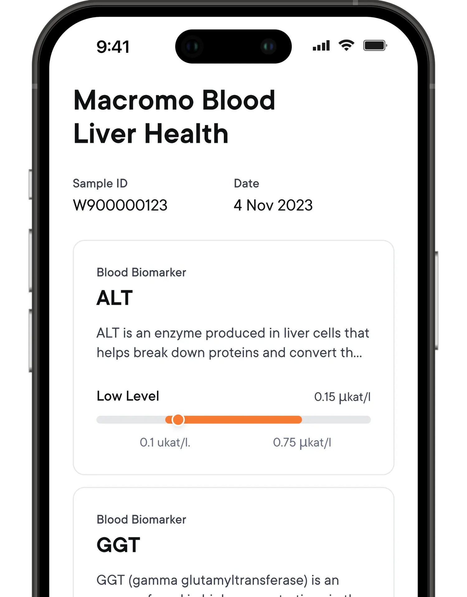 You will receive your blood test results within 5 business days via the Macromo app. The app will display your results clearly and easily, including recommendations for improving your health.